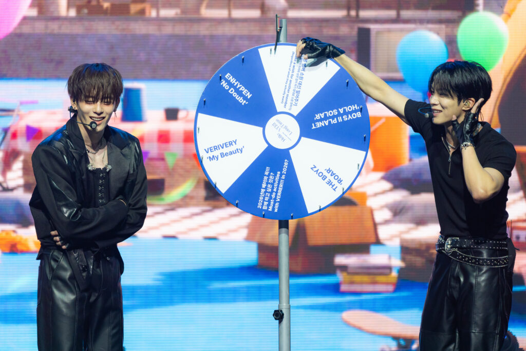 The intense performances were followed by the ‘VCR’ segment that featured a telepathy Bingo game where the members played a game where they had to give the same answers for various phrases such as ‘a lifetime song’ and ‘ending song’. The VCR drew large sounds of laughter from the audience due to their hilarious unsynchronised answers. The segment ended with the members picking Dongheon and Kangmin to do a 3-Set-Aegyo penalty for VERRERs.