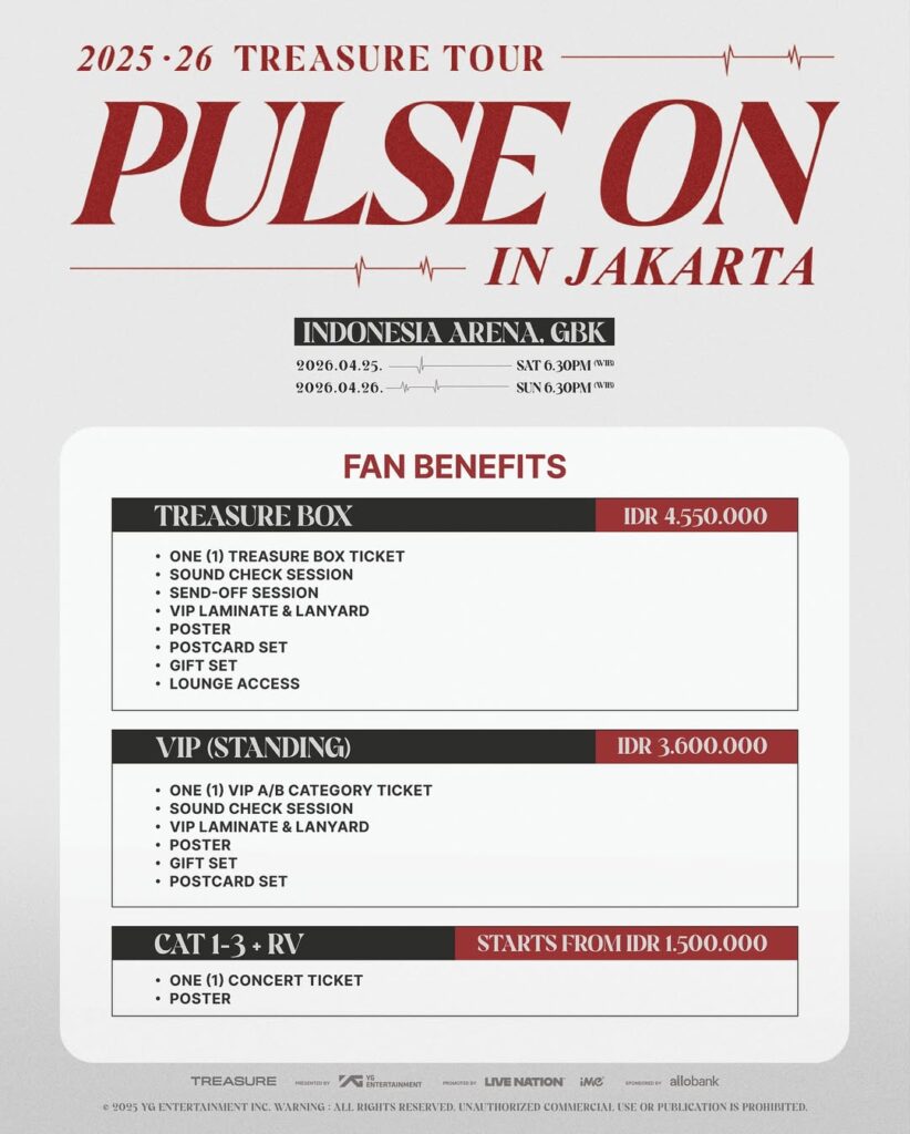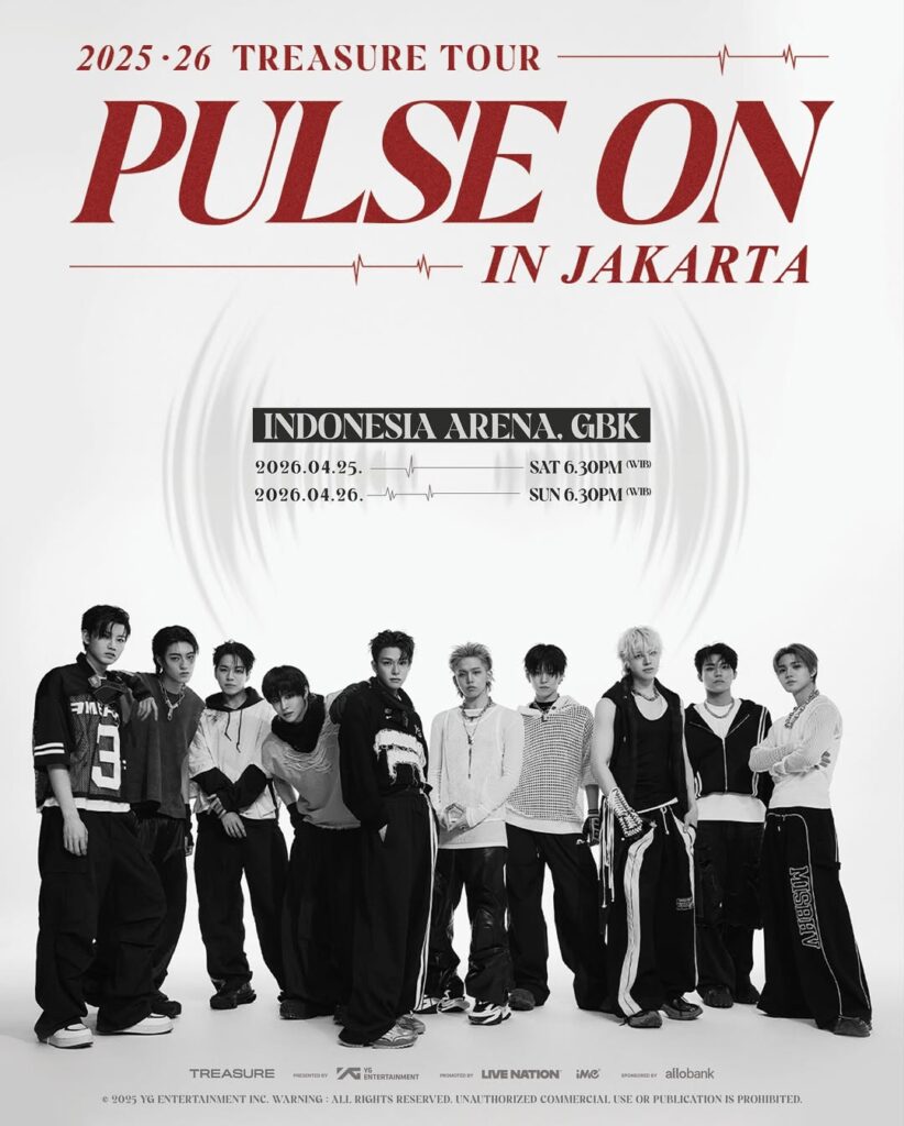 Two years after their successful 2024 TREASURE RELAY TOUR ‘REBOOT’ IN JAKARTA, TREASURE are scheduled to return to the city for the 2025-26 TREASURE TOUR (PULSE ON) IN JAKARTA. The event will be held on April 25-26, 2026, at Indonesia Arena. Just like their previous shows, TREASURE will bring their top-notch performances for Indonesian Treasure Makers.